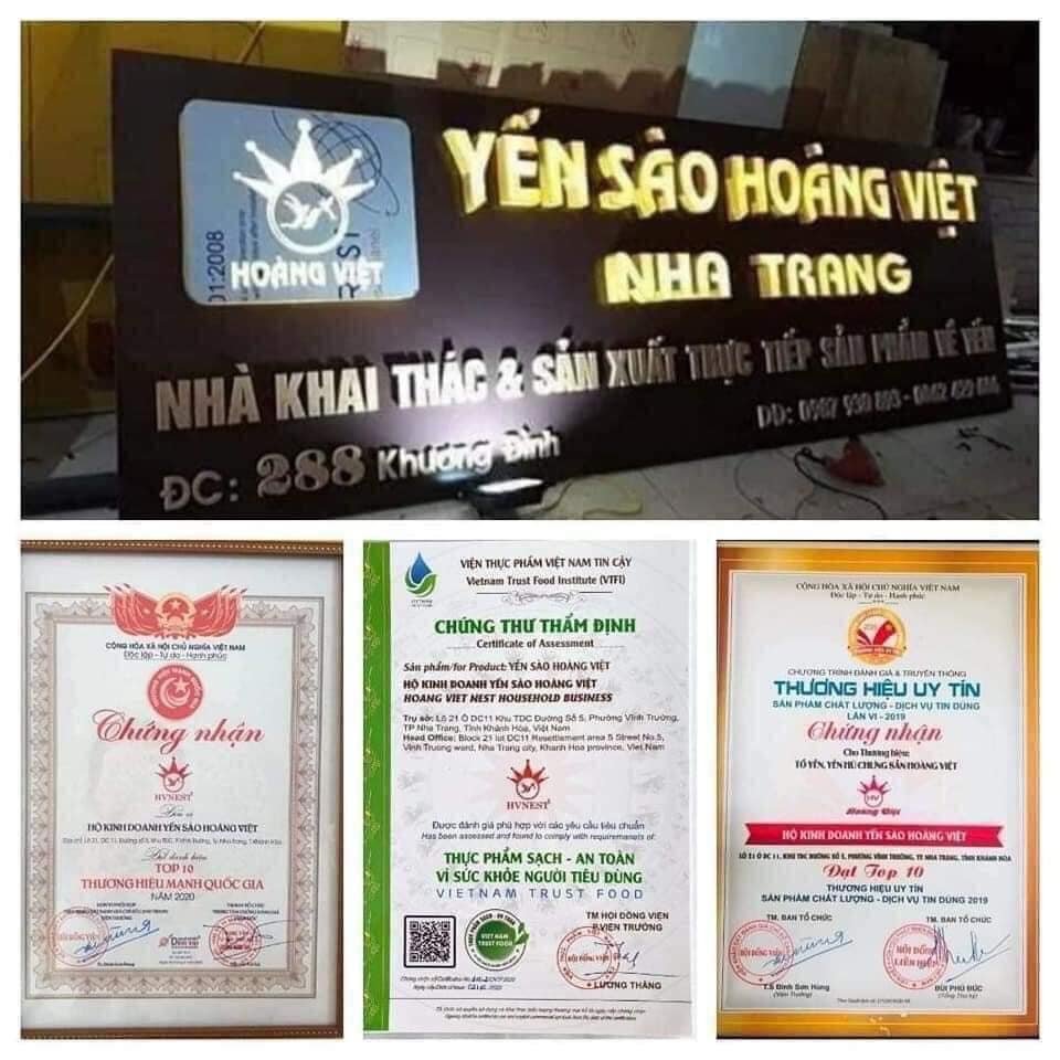 - Yến sào Hoàng Việt - Nước yến Nha Trang Khánh Hòa đã đạt chứng nhận TOP 10 THƯƠNG HIỆU SP UY TÍN, CHẤT LƯỢNG NĂM 2019. Yến sào Hoàng Việt đã đạt chứng nhận TOP 10 THƯƠNG HIỆU MẠNH QUỐC GIA NĂM 2020. Đã có hàng triệu khách hàng yêu thích, tin dùng sản phẩm để bồi bổ sức khỏe người thân